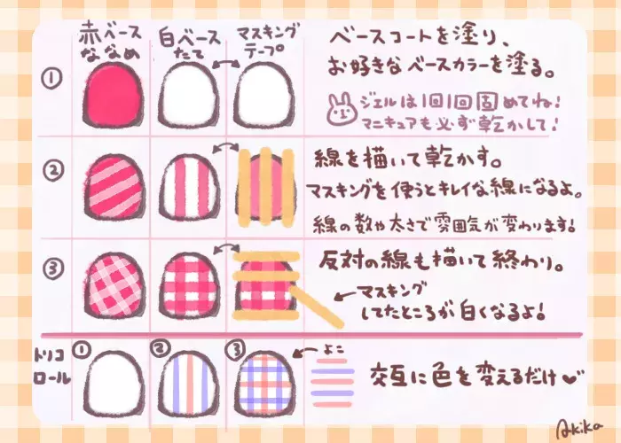 チェックネイル セルフ- 初心者さんが初めに揃えるべき物&ジェルネイルのやり方って? ①エタノールで爪の油分をオフしよう! ジェルネイルは水分や油分がついていると定着しにくくなるので、施術前にコットンにエタノールを含ませ、爪を消毒します。 ②まずはクリアジェルを塗るよ💅 カラーの前に塗るベース用と、最後の仕上げに塗るトップコート用のクリアジェルが セルフで簡単! 流行のギンガムチェックネイルのやり方イラストコラム 今年流行りの柄といえば、ギンガムチェック! ファッションだけではなくネイルのデザインとしても流行していますよね。 自分でやるには一見難しそうに見えますが、やり方さえ知っていれば、誰でも簡単にギンガムチェックネイルにすることができますよ。 必要なマニキュア